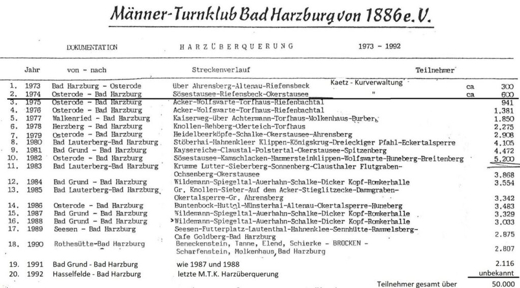 Schon bei der ersten neuen Harzüberquerung im Jahr 1975 bewährt sich das System und mit 941 Teilnehmern und rd. 250 ehrenamtlichen Helfern wird es eine allgemein gelobte und vor allen Dingen auch eine finanziell erfolgreiche Veranstaltung. Diese besondere Wanderung spricht sich im weiten Einzugsbereich von Bad Harzburg schnell herum und „Die HARZÜBERQUERUNG“ des MTK wird nicht nur für den Verein, sondern auch für den Kurort Bad Harzburg ein voller Erfolg.