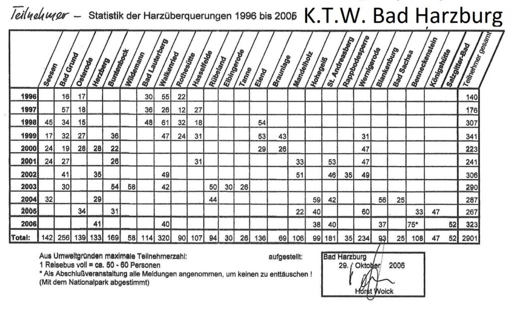 Horst Woick ging in den Ruhestand, wurde aber ehrenamtlicher Wanderführer der neuen „Kurverwaltung“ (Kur-, Tourismus- und Wirtschaftsbetriebe der Stadt Bad Harzburg – KTW) und Waldführer im Nationalpark HARZ. Was lag nun also näher als die Harzüberquerungen mit einer neuen Organisation als Kurgastwanderung wieder aufleben zu lassen.
